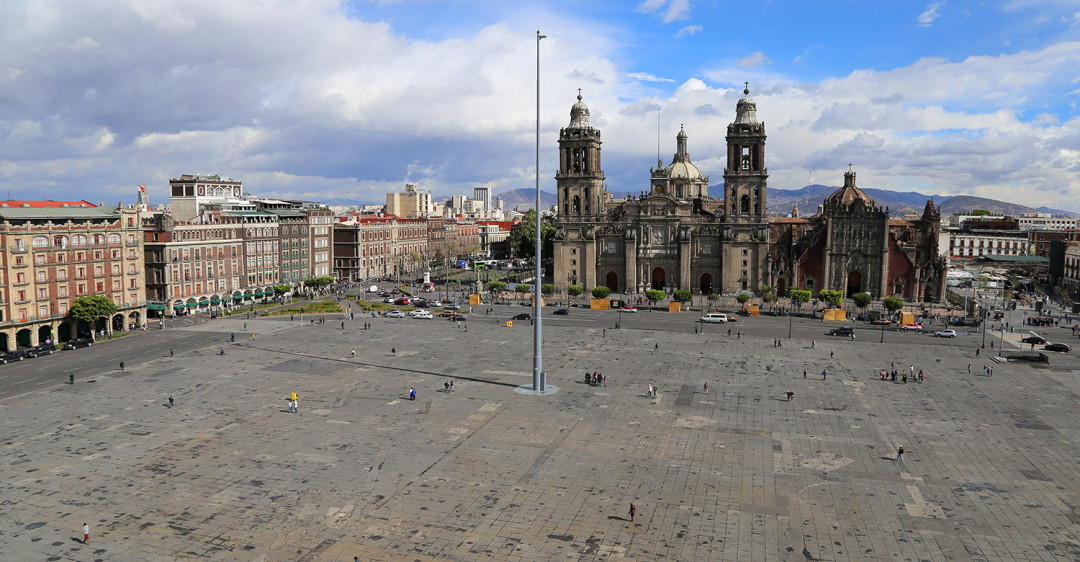 На северной стороне площади Сокало расположен кафедральный собор Успения Пресвятой Богородицы — старейший и один из самых больших римско-католических храмов на континенте. Первую базилику построили на месте разрушенного ацтекского святилища в 1524 году. В 1573-м началось строительство нового кафедрального собора, продолжавшееся до 1813 года. Этим объясняется такое многообразие стилей, слившихся воедино в архитектуре собора. Грандиозное здание вобрало черты барокко, ренессанса, неоклассицизма. Главный портал украшают колонны, статуи апостолов и горельеф с изображением Успения Девы Марии. Звонницы колокольных башен по обе стороны от главного портала несут 25 колоколов.